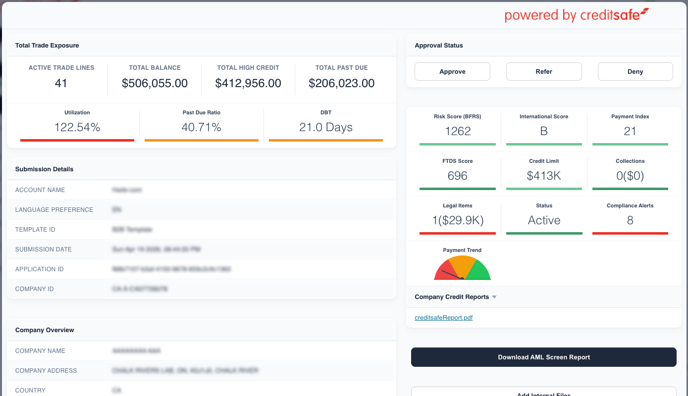 Embedded with Creditsafe's 430M+ company reports across 200 countries & territories. Experience automated, real-time Monitoring, Credit Reports, business and individual AML/KYC screening, Check & Decide Decision Models, and world-class support.